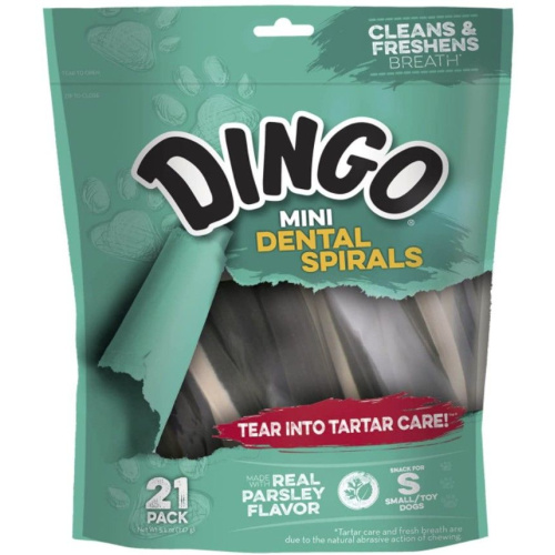 Dingo Dental Spirals Fresh Breath Dog Treats - Mini - 21 PackDingo Mini Dental Spirals are ideal for getting your dog to freshen its breath without you even having to lend a hand! The long twist shape encourages your dog to chew down on them, cleaning and freshening its breath at the same time. Made with real parsely and peppermint, these long-lasting snacks are the perfect treat to make those doggie kisses even better!