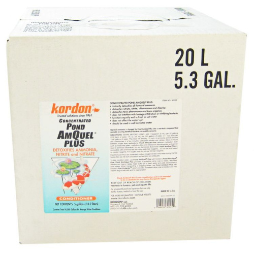 Kordon Concentrated Pond AmQuel + - 5 GallonsKordon Pond AmQuel Plus Concentrate removes chlorine, chloramines, ammonia, nitrates, and nitrites from pond water safely, easily and quickly. This concentrated formula treats larger volumes of water in a single step.